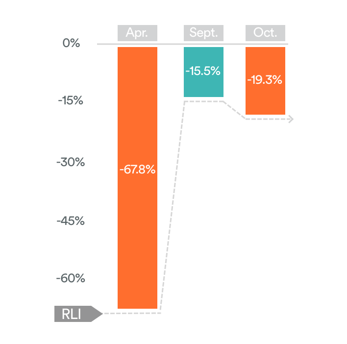 Our Recovery Leading Indicator (RLI) tracks spend in select discretionary categories to help brands measure consumer confidence throughout the recovery. It compares weekly spend in categories such as Salons, Apparel Retailers, Casual Dining and QSR restaurants, among others. For the week of Oct. 29, the RLI is down -19.3% YoY, the worst we’ve seen since late August.