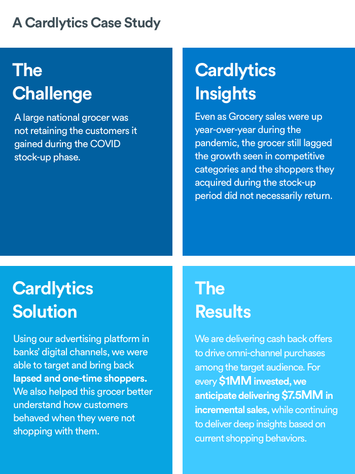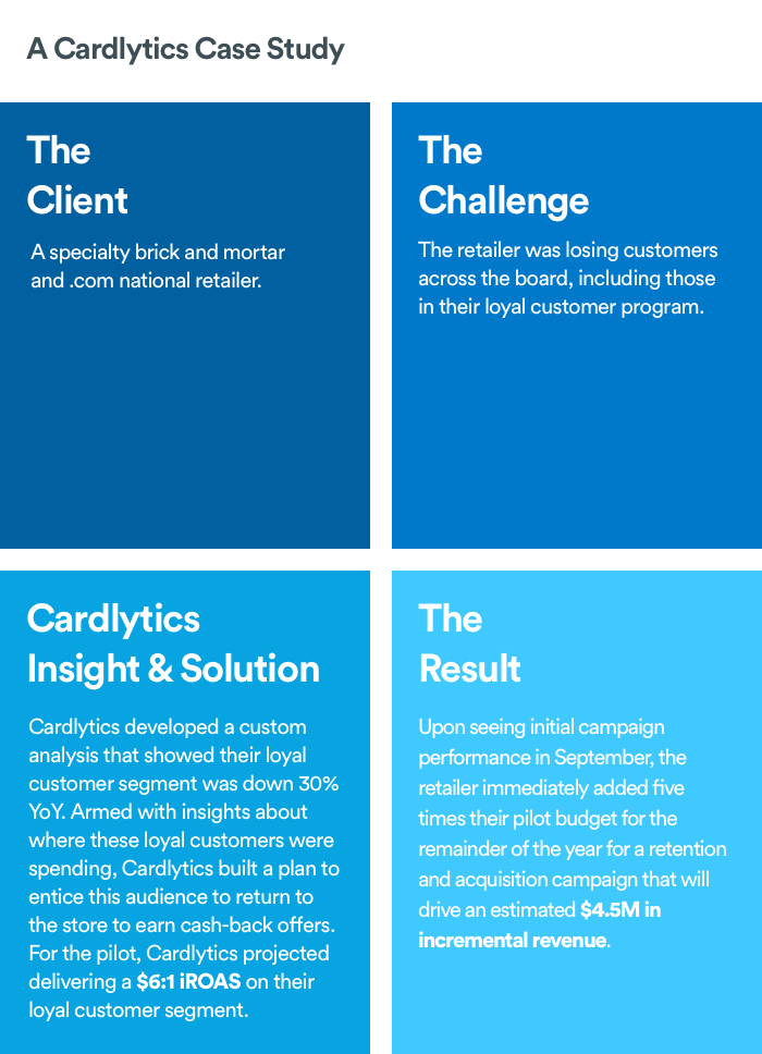 With an advertising platform that reaches more than 160 million bank customers, Cardlytics can help marketers create targeted campaigns that answer: