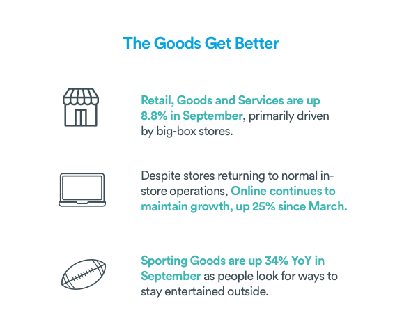 Travel continues to suffer as the pandemic sees new surges and restrictions remain, down 49% YoY. But, this hard hit industry has recovered significantly after dipping to its worst levels at -85% YoY in April. However, with four straight weeks of growth led by Alternative Lodging (+25% YoY in Sept.), the path to recovery continues.