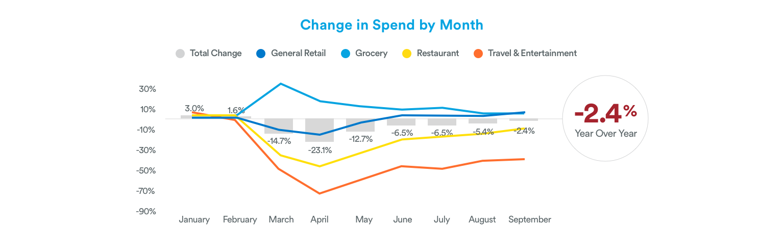 Our Recovery Leading Indicator (RLI) tracks spend in select discretionary categories to help brands measure consumer confidence during the recovery. It compares weekly spend in categories such as Salons, Apparel Retailers, Casual Dining and QSR restaurants, among others. After a low of -68% year-over-year (YoY) in April, the RLI is only down 15.5% through September.